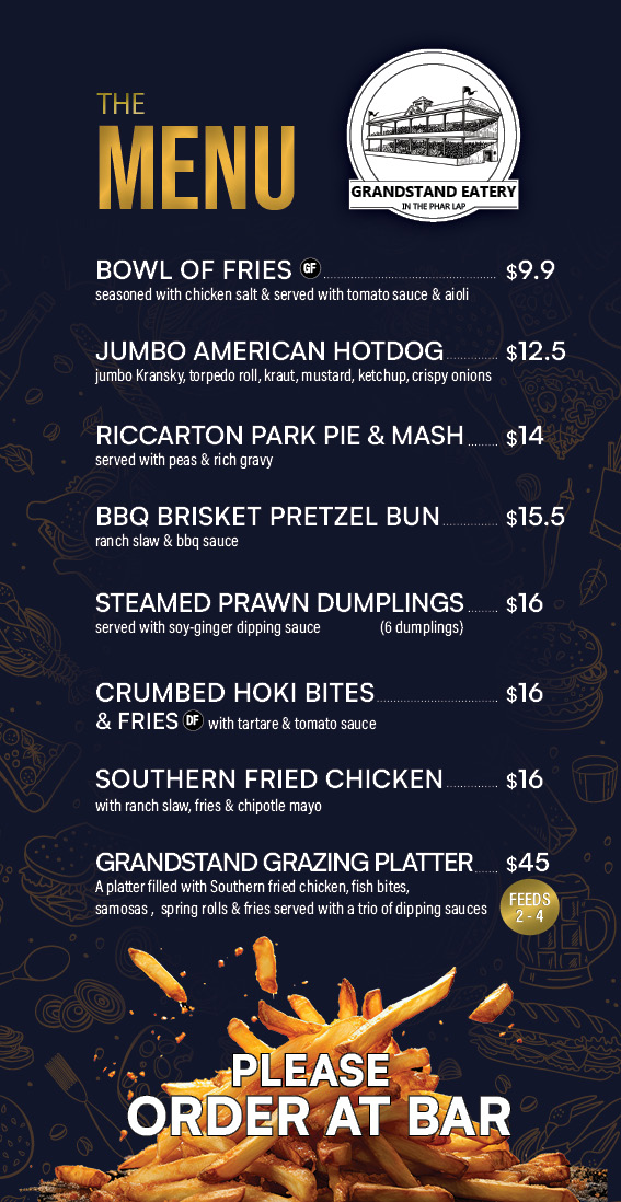Balmerino Room & Restaurant (Ground Floor): Buffet lunch 12:30 – 3:00 pm, $45pp (member discount applies). Overlooks the birdcage with tote facilities and a bar—where great food meets a vibrant racing atmosphere